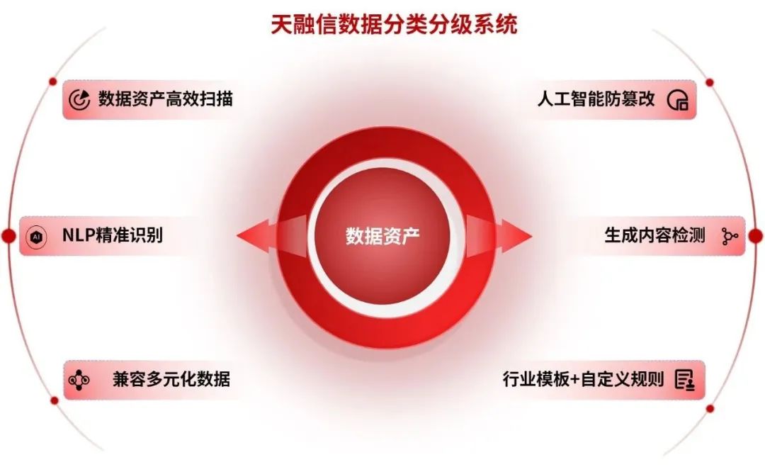 天融信数据分类分级系统以数据资产为核心,依托AI前沿技术构建数据治理体系。产品兼容多元化数据,借助天问大模型、自然语言处理等实现精准识别打标,采用“行业模板+自定义规则”模式动态调整分类策略,保障定级与业务同步,同时具备生成内容检测、模型防篡改等多层安全机制,帮助客户更系统、准确地理解数据的内涵、关联和价值,实现快速厘清数据资产底数、数据类型精准定级、数据风险态势监控等目标。